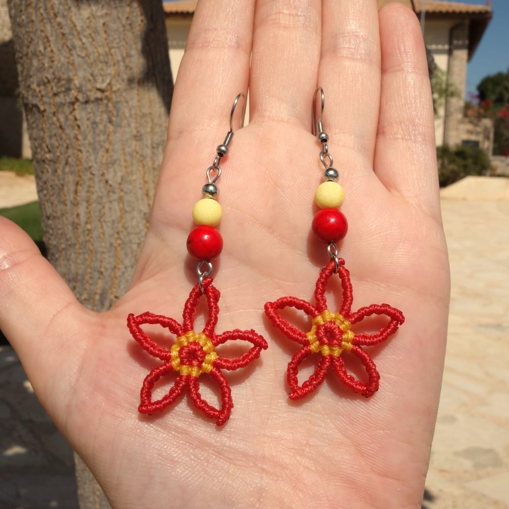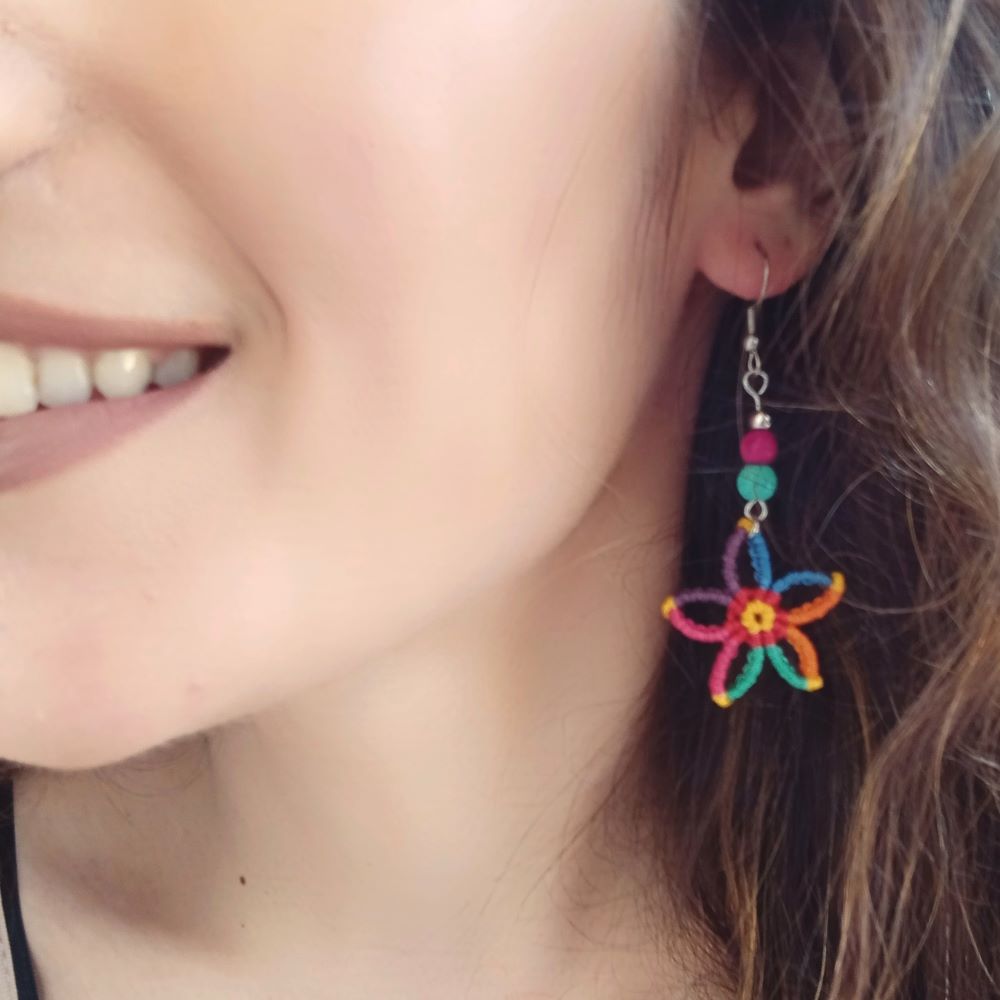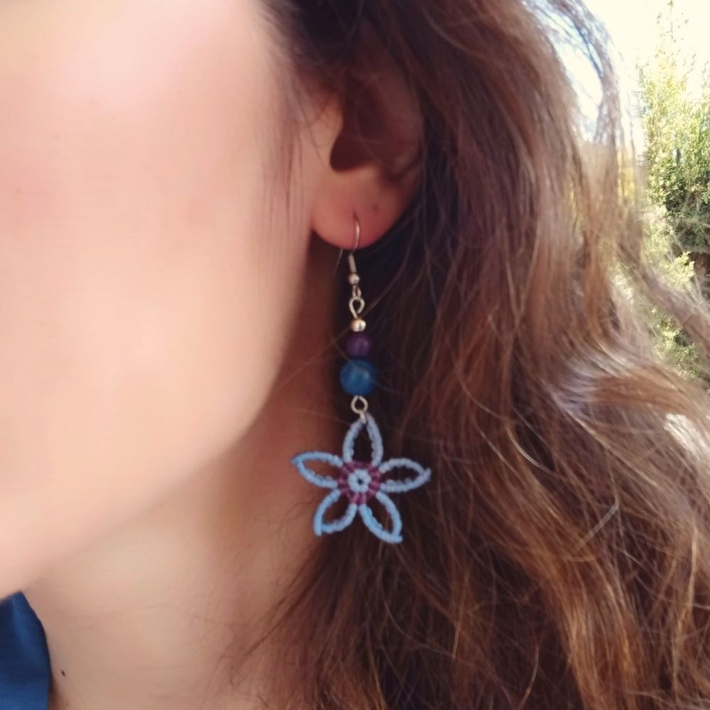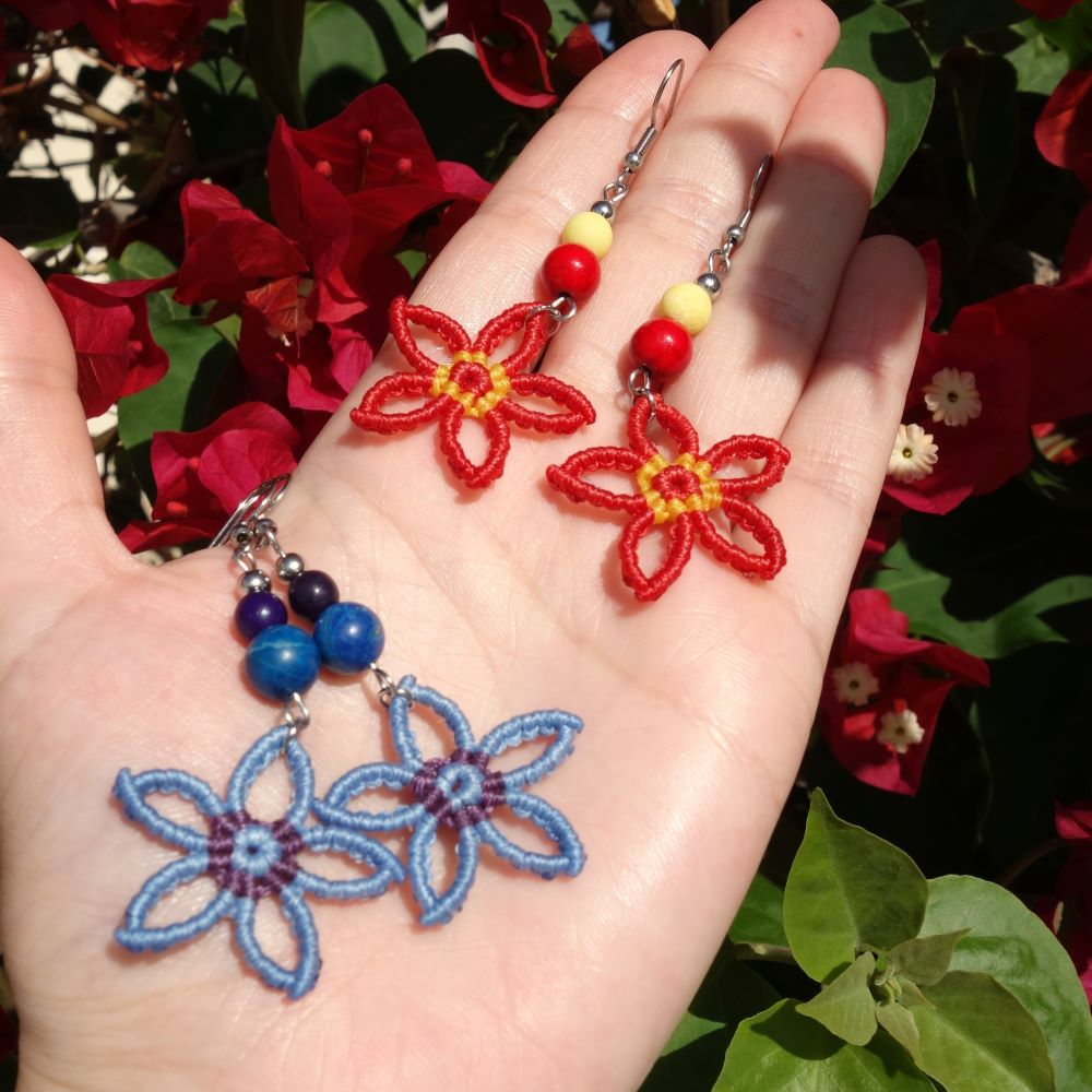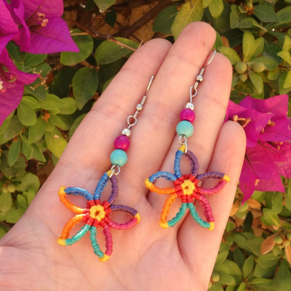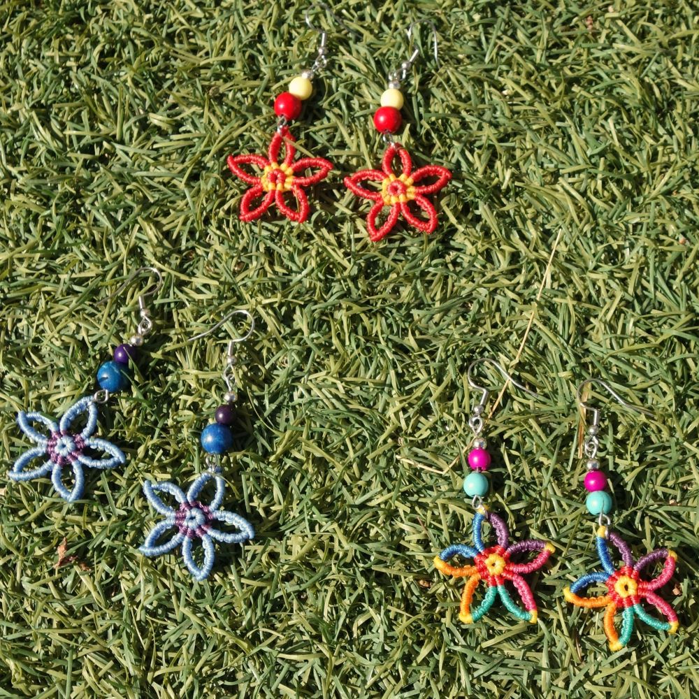 Χειροποίητα μακραμε σκουλαρίκια λουλουδάκια με χαολίτες και ατσάλινα γαντζάκια. Μήκος 7 εκ. Ανάλαφρα και πολύχρωμα.