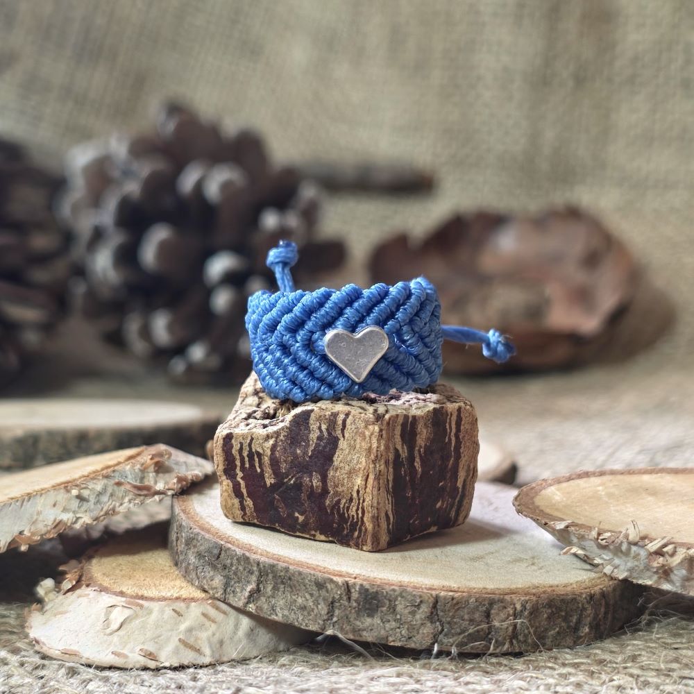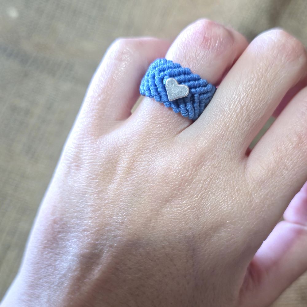 Χειροποίητο μακραμε δαχτυλίδι σε μπλε με ατσάλινη καρδιά και ρυθμιζόμενο μέγεθος.