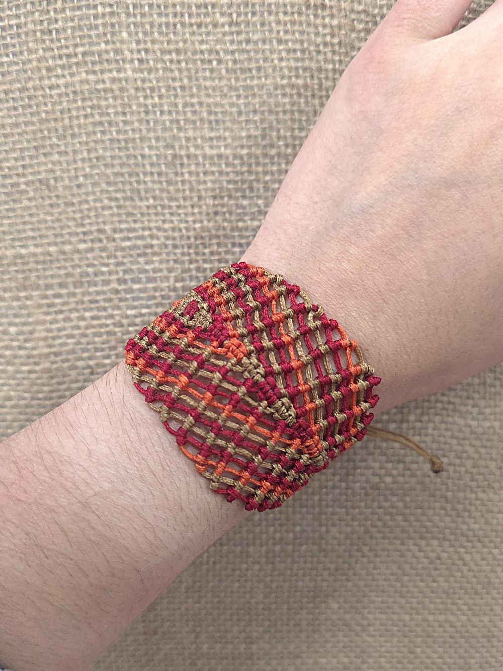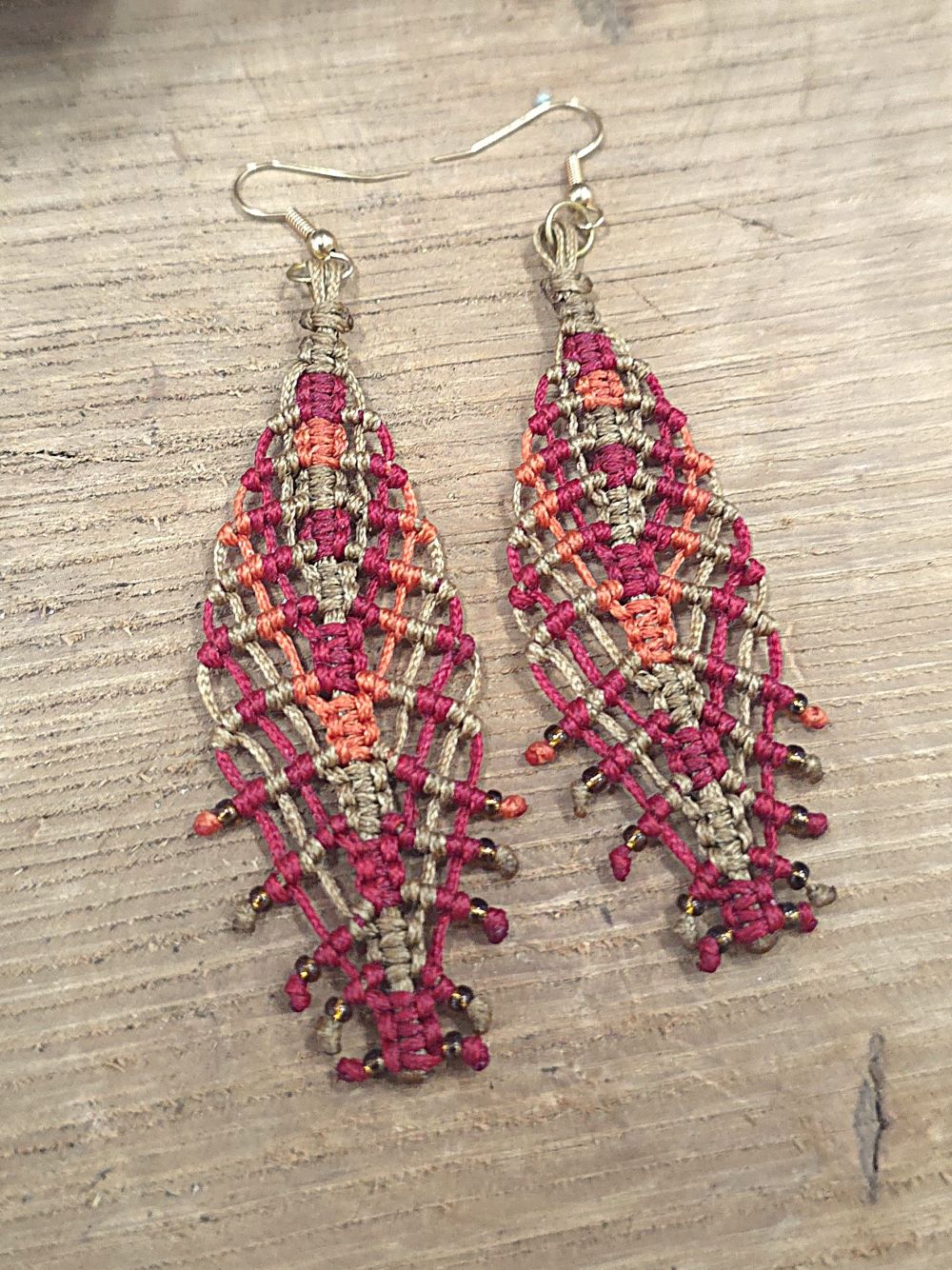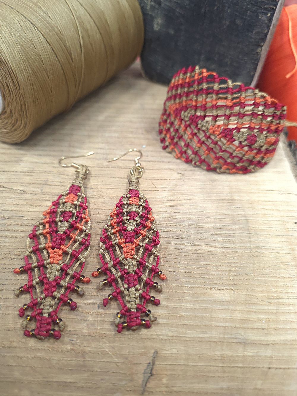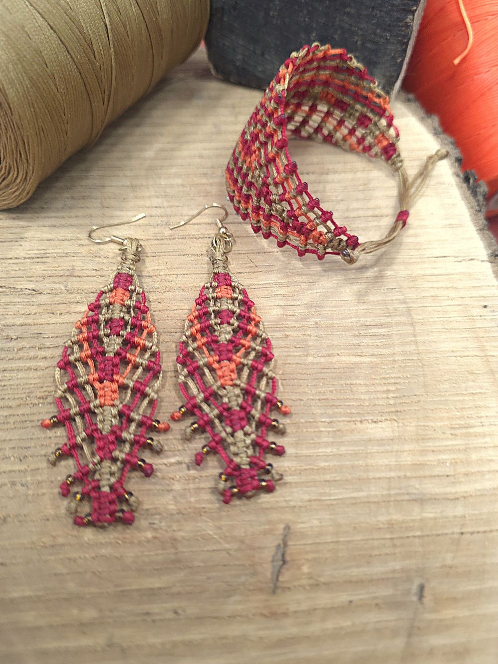 Ένα ζεστό, γήινο σετ που μοιάζει να κρατά μέσα του τα χρώματα της ερήμου. Τα χειροποίητα μακραμε σκουλαρίκια και το βραχιόλι υφαίνονται κόμπο κόμπο με κηροκλωστή σε αποχρώσεις άμμου, κόκκινου και πορτοκαλί, δημιουργώντας ένα μοτίβο που θυμίζει φλόγα.