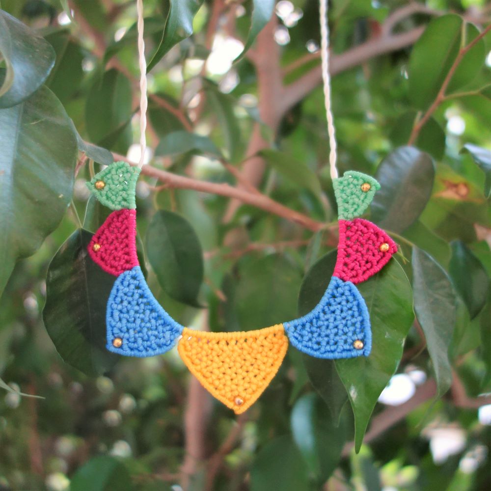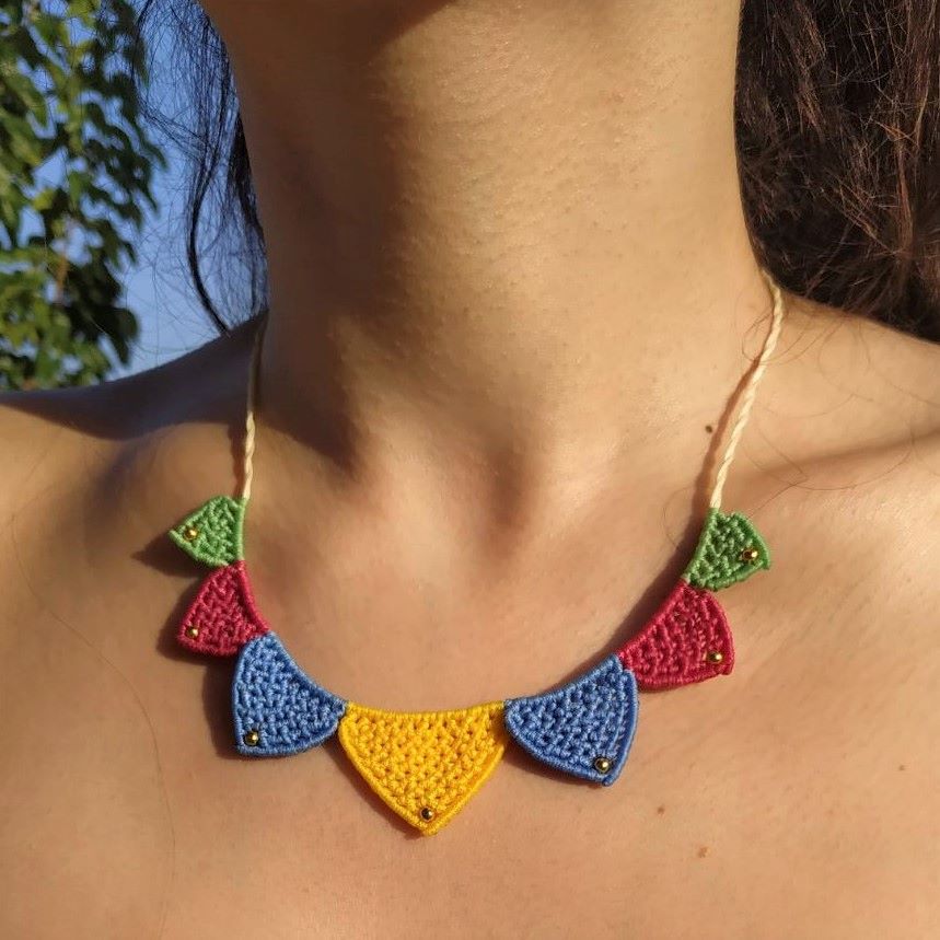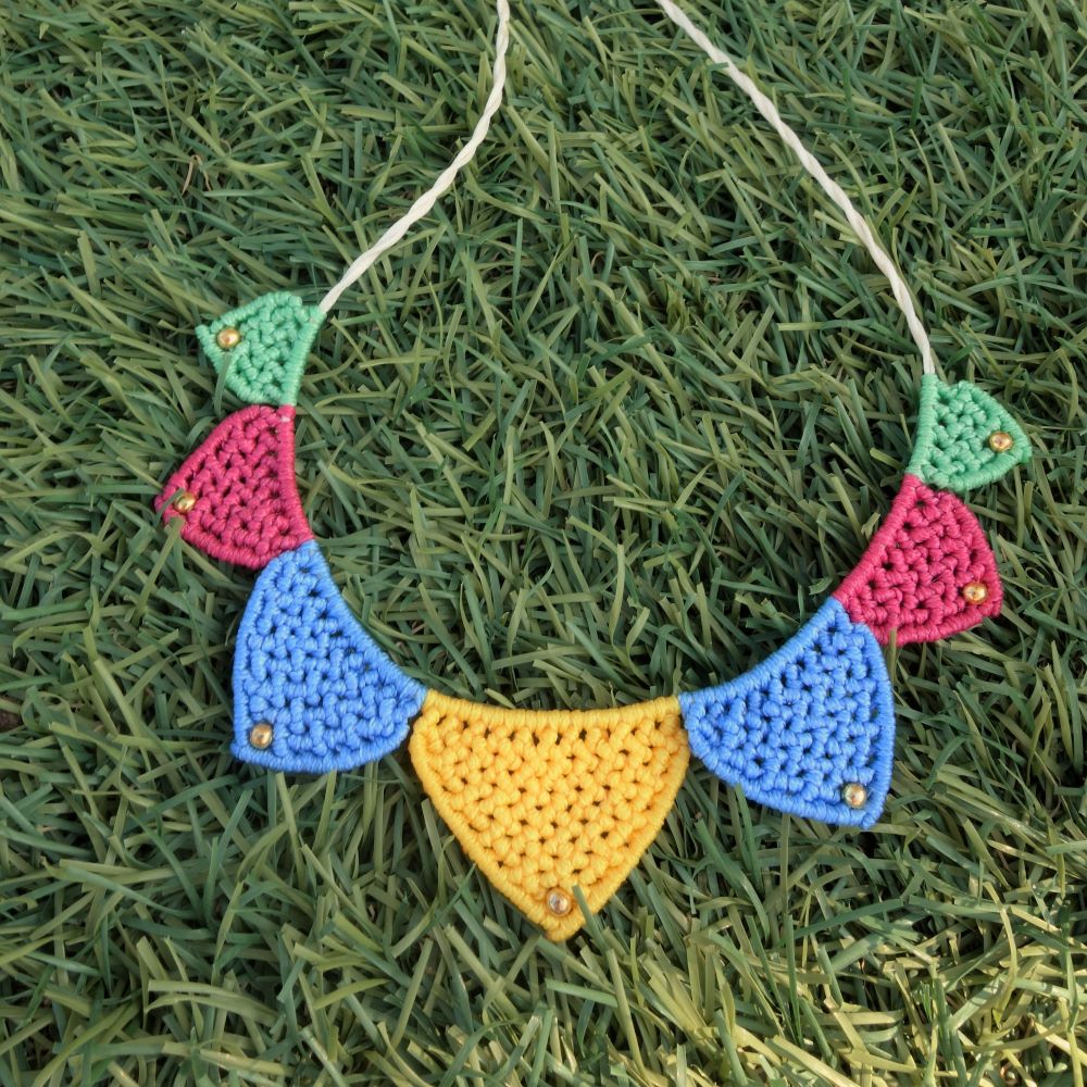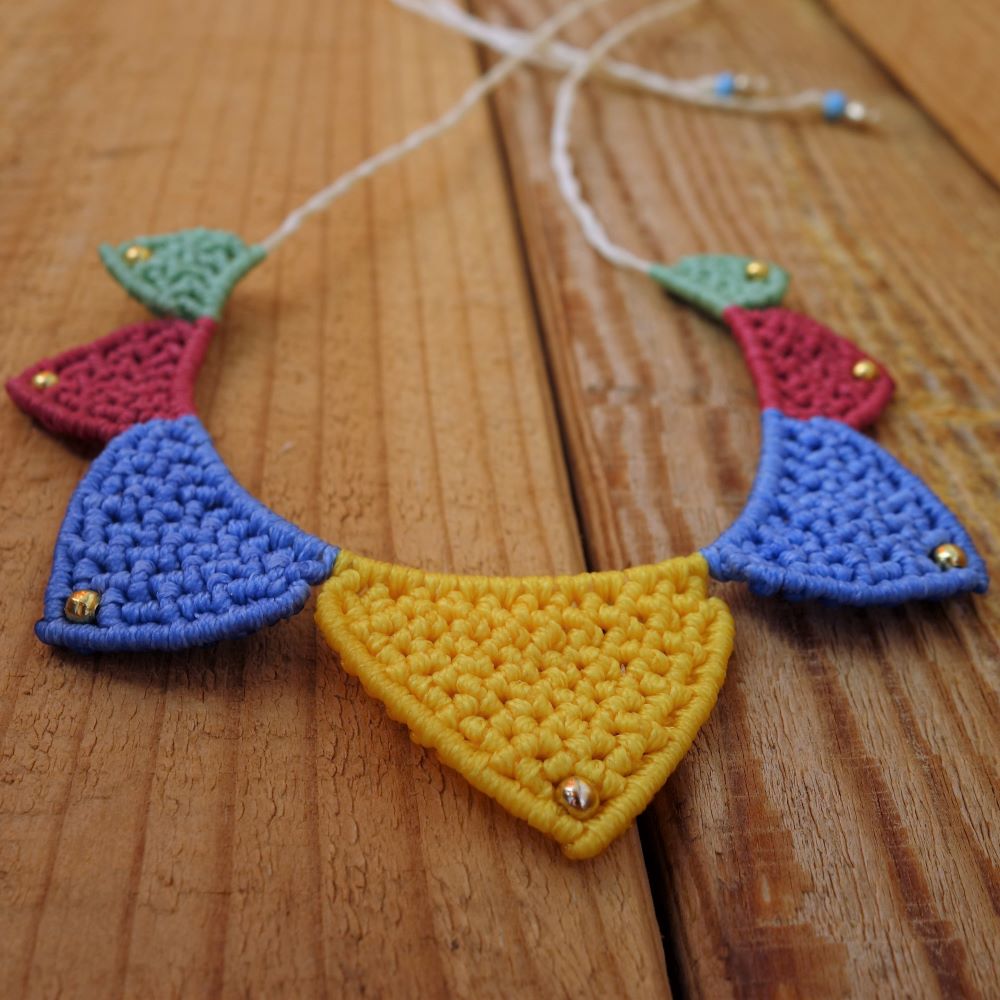 Το Fiesta Mood είναι ένα χαρούμενο, ζωηρό χειροποίητο μακραμε κολιέ με πλεκτά γεωμετρικά μοτίβα σε φωτεινά χρώματα. Κάθε τρίγωνο στοιχείο είναι δουλεμένο με προσοχή σε αποχρώσεις του κίτρινου, μπλε, φούξια και πράσινου ενώ μικρές χάντρες φωτίζουν τις άκρες με μια παιχνιδιάρικη λεπτομέρεια.