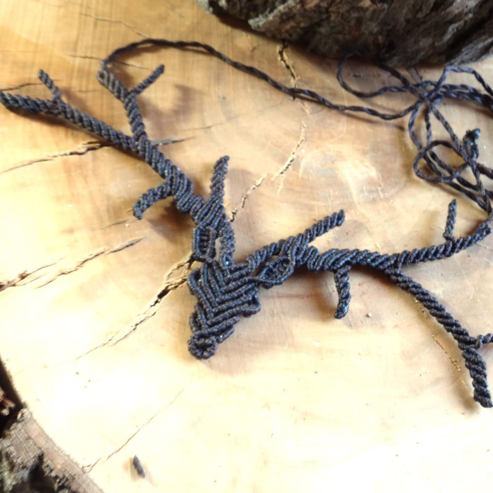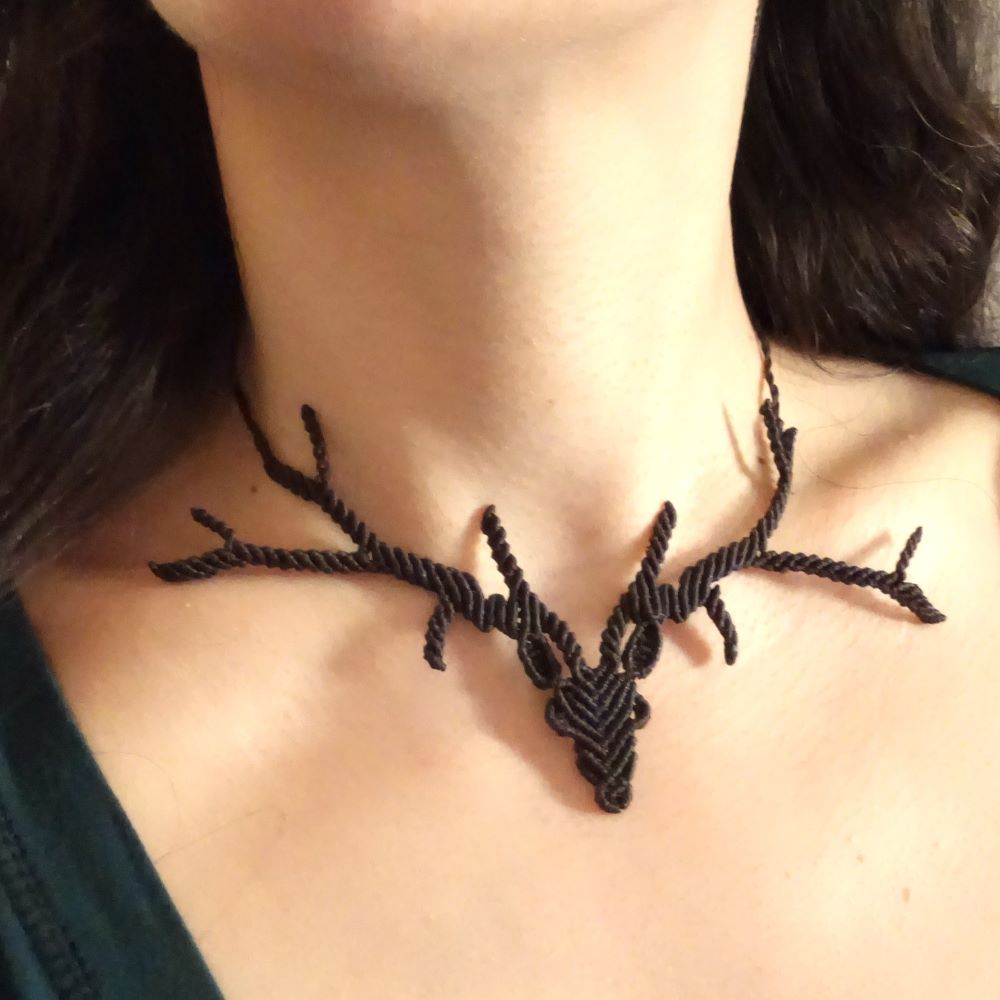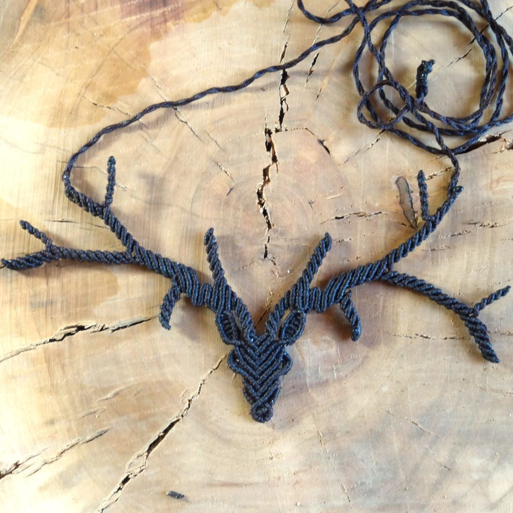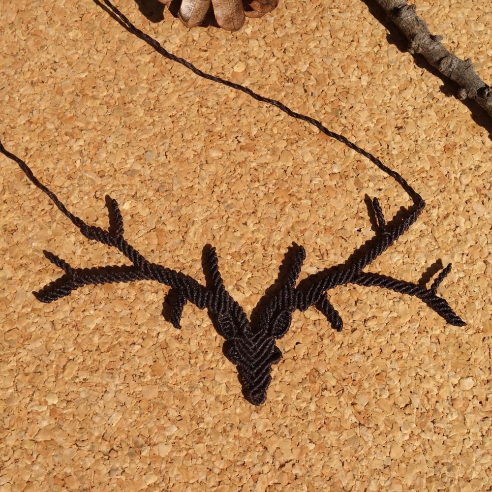 Χειροποίητο μακραμέ κολιέ σε σχέδιο ελαφιού, φτιαγμένο με καφέ κηροκλωστή και αυξομείωση στο μήκος.