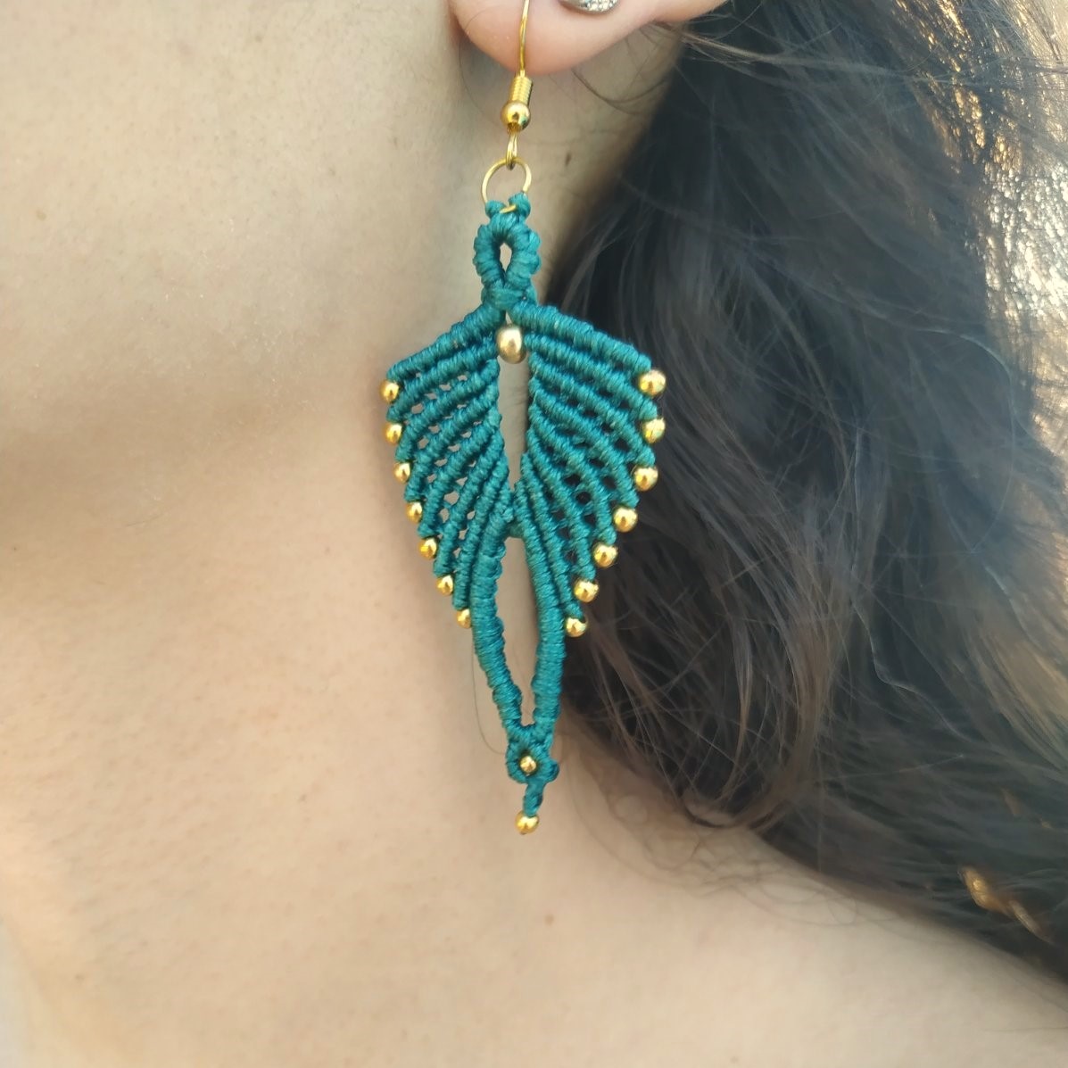 Χειροποίητα μακραμε σκουλαρίκια με οργανικό σχέδιο και χρυσές λεπτομέρειες σε πετρόλ και σομόν.