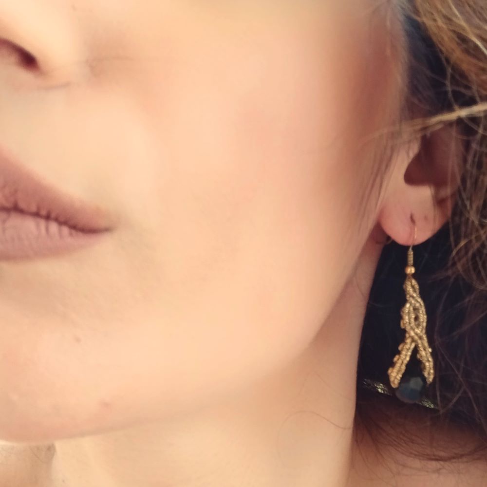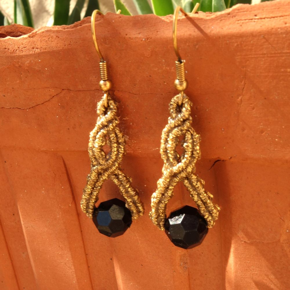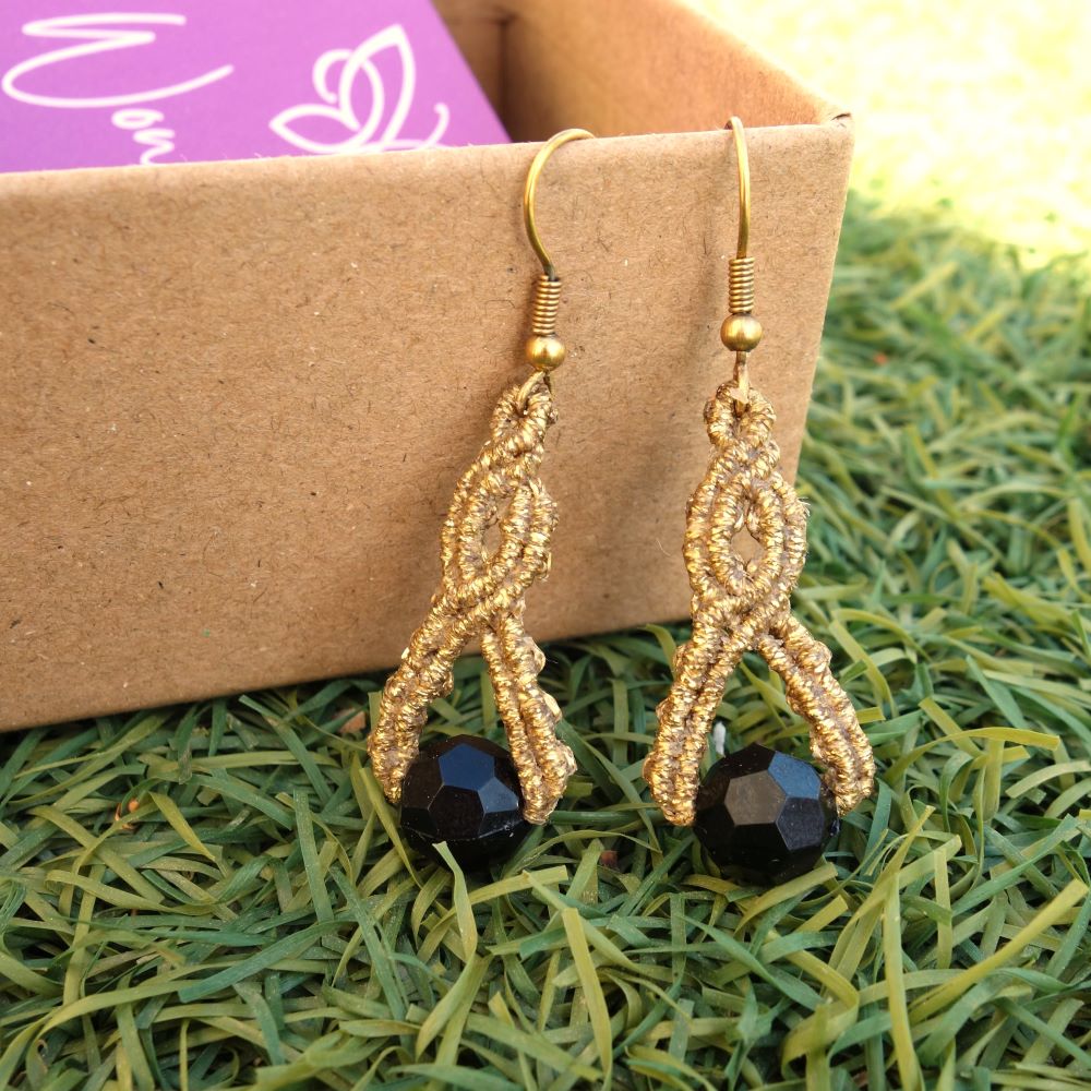 Χρυσά μακραμε σκουλαρίκια με μαύρο κρύσταλλο και elegant χαρακτήρα.