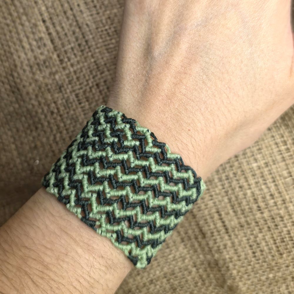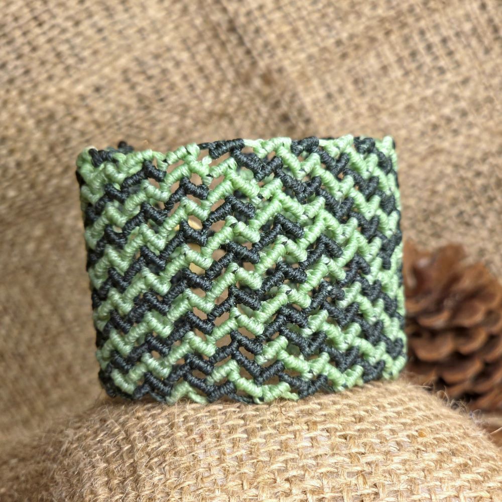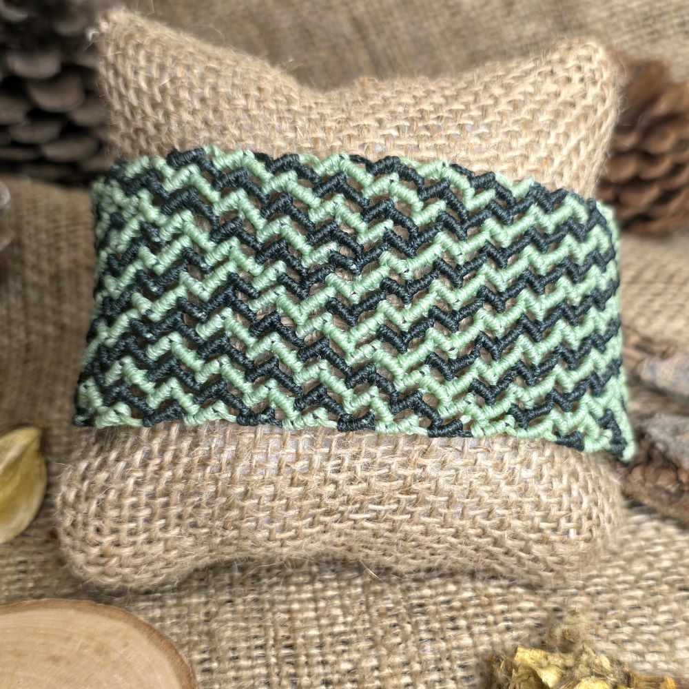 Το Green Rhythm είναι ένα φαρδύ χειροποίητο μακραμε βραχιόλι που αποτυπώνει τον ρυθμό της φύσης μέσα από αρμονικές αποχρώσεις κυπαρισσί και ανοιχτού πράσινου. Το γεωμετρικό μοτίβο του δημιουργεί μια αίσθηση κίνησης και ισορροπίας ενώ αγκαλιάζει τον καρπό με άνεση και σταθερότητα. Κλείνει με κουμπί ώστε να εφαρμόζει εύκολα και να παραμένει σταθερό στο χέρι. Με μήκος που καλύπτει καρπό 15 εκατοστά είναι ιδανικό για καθημερινή χρήση αλλά και για πιο ιδιαίτερες εμφανίσεις. Ένα κόσμημα με φυσικό χαρακτήρα και boho αισθητική που ταιριάζει σε κάθε στυλ.