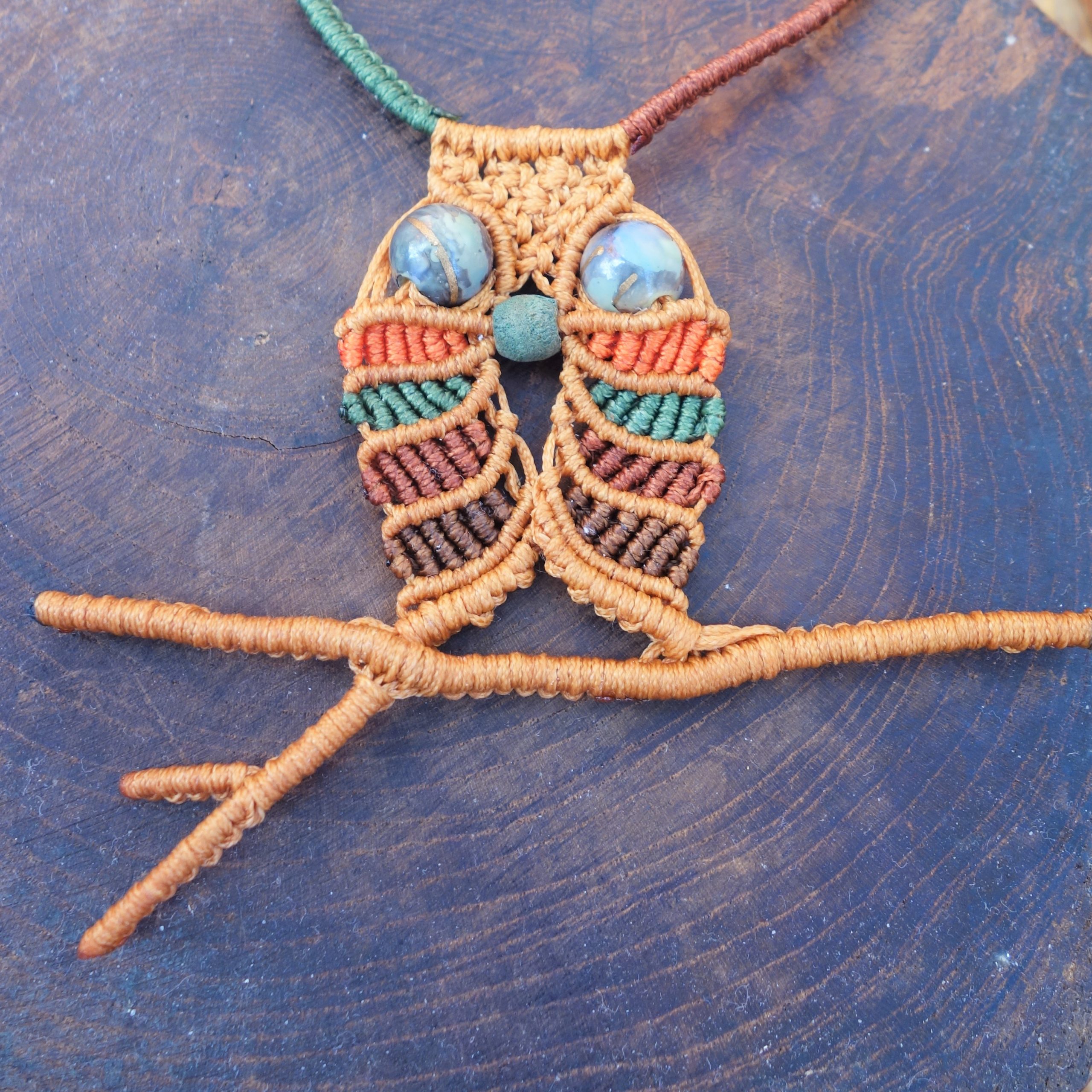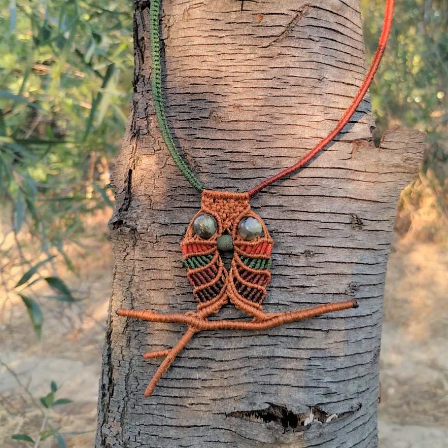 Μακραμέ κολιέ σε σχήμα κουκουβάγιας, φτιαγμένο με κηροκλωστή άριστης ποιότητας σε αποχρώσεις του καφέ, πράσινου και κεραμιδί. Ένα μοναδικό φυλαχτό σοφίας με φυσική, boho αισθητική.