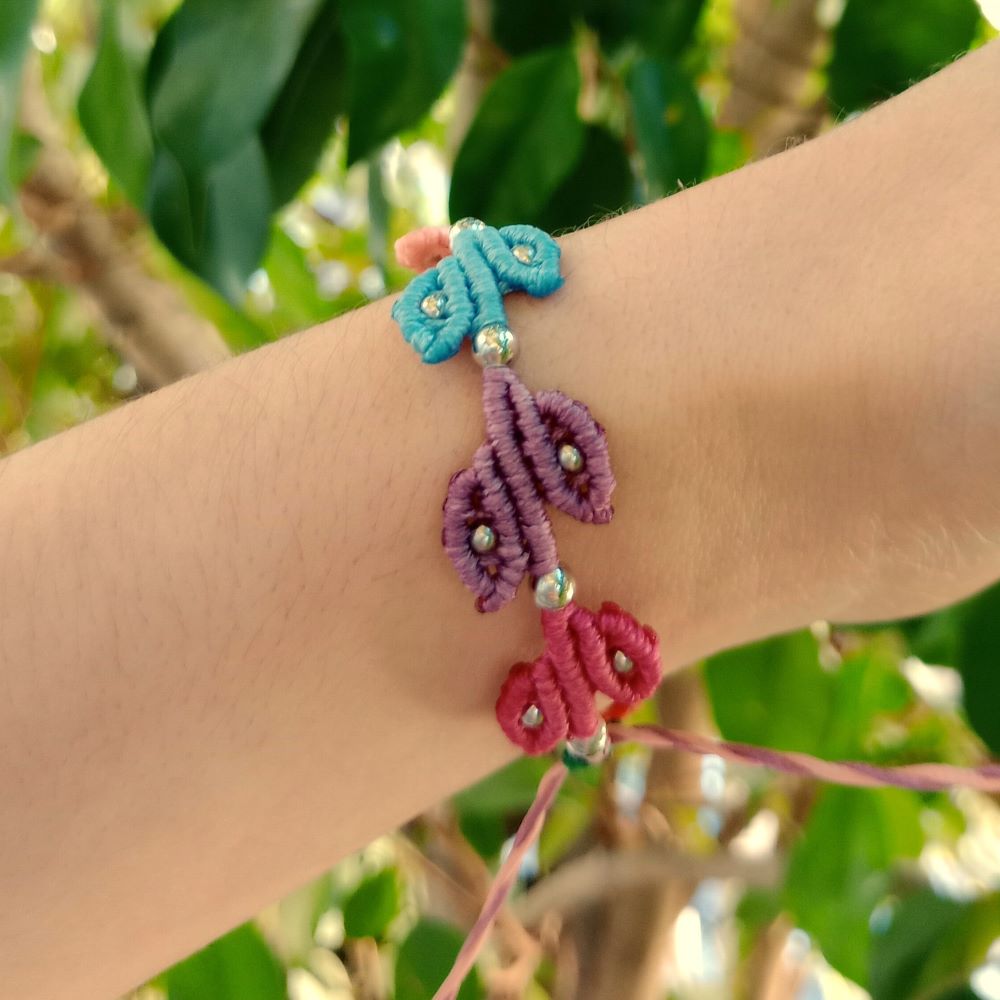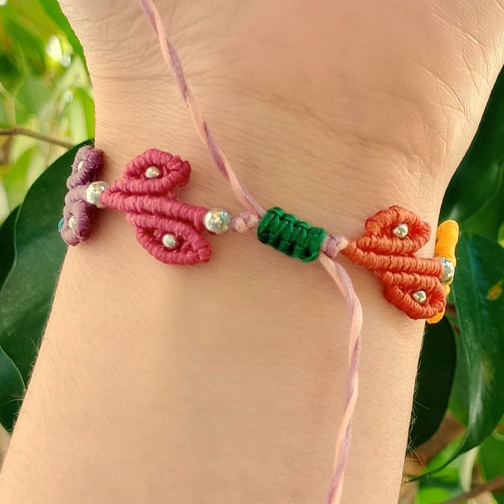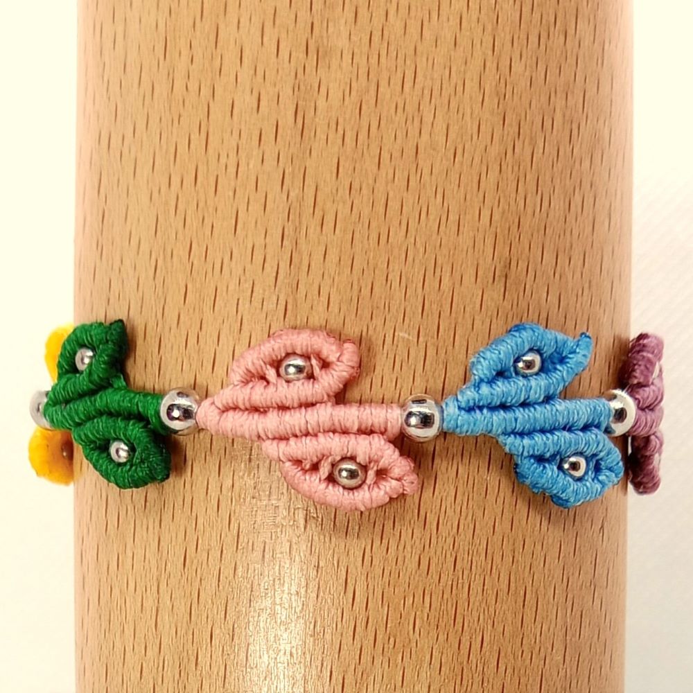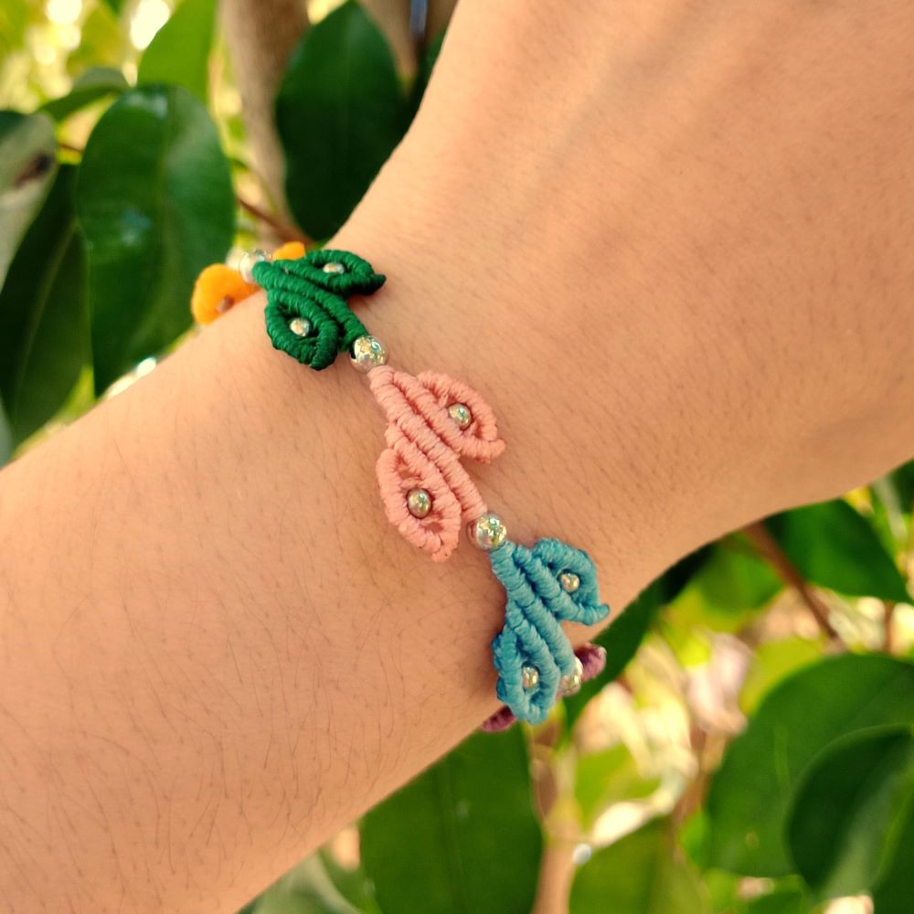Το Leaf Chain είναι ένα χειροποίητο μακραμε βραχιόλι με μικρά φυλλαράκια δεμένα σε σειρά δημιουργώντας μια φυσική και παιχνιδιάρικη σύνθεση. Κάθε φύλλο είναι πλεγμένο στο χέρι με πολύχρωμες κλωστές και διακοσμημένο με μικρές μεταλλικές χάντρες που προσθέτουν διακριτική λάμψη.