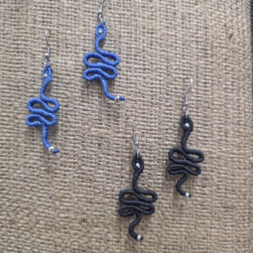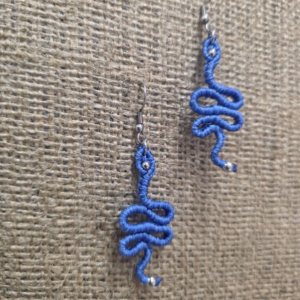 Μακραμε σκουλαρίκια σε γαλάζιο και μαύρο με serpentine σχέδιο και ασημί λεπτομέρειες. Ελαφριά, κομψά και χειροποίητα με ατσάλινα γαντζάκια.
