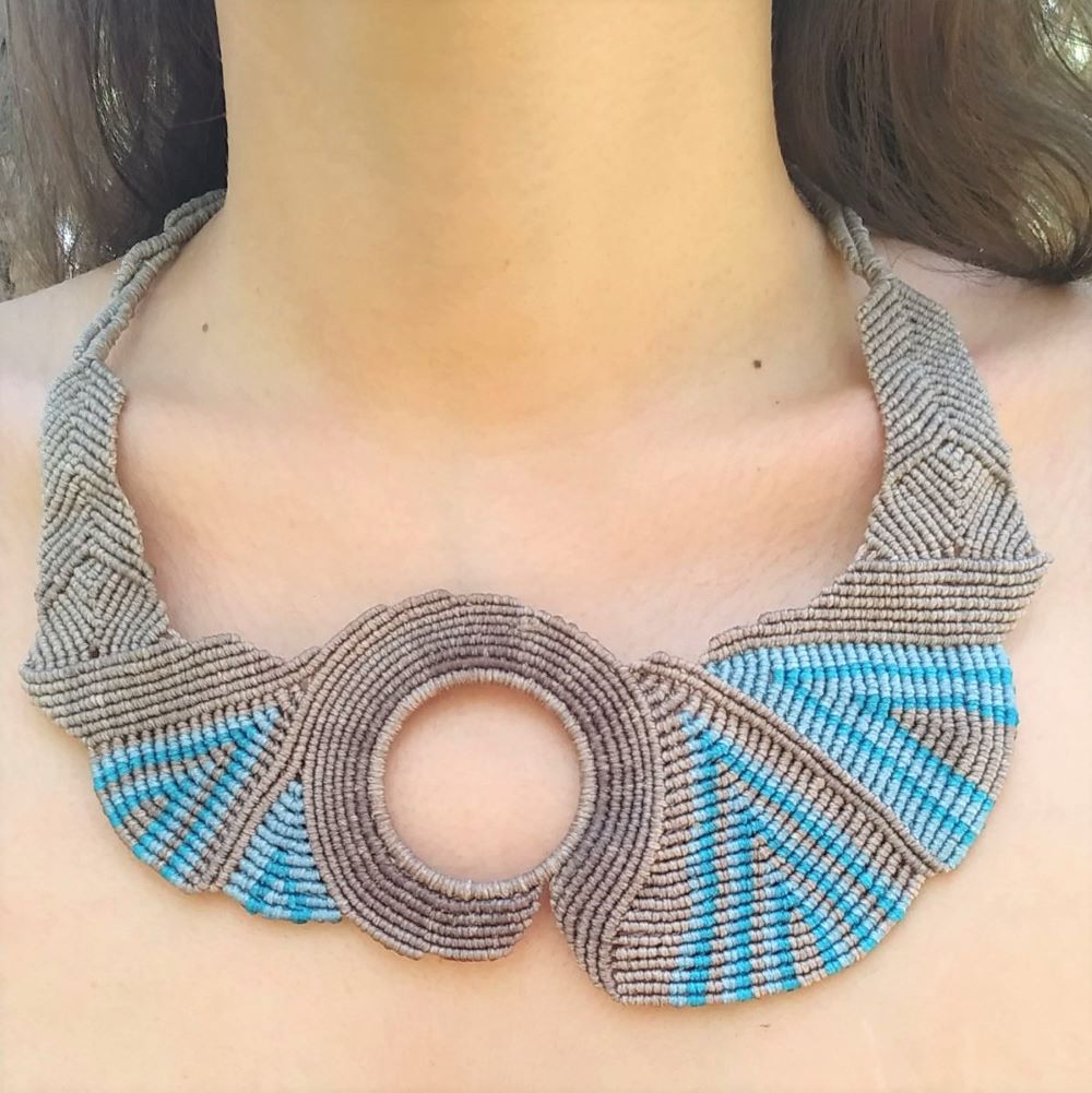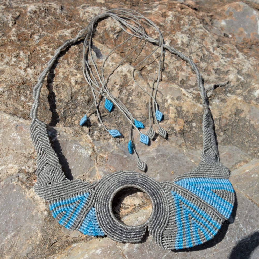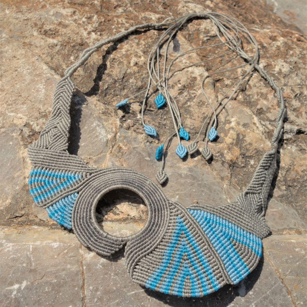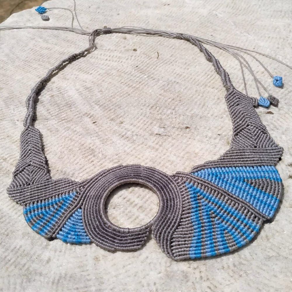 Το κολιέ διαθέτει αυξομείωση και μπορεί να φορεθεί κοντά σαν εντυπωσιακό statement neckline ή πιο χαμηλά για boho αισθητική. Η χειροποίητη δουλειά απαιτεί πολλές ώρες προσεκτικής πλέξης, κάτι που το καθιστά μοναδικό και ιδιαίτερο.