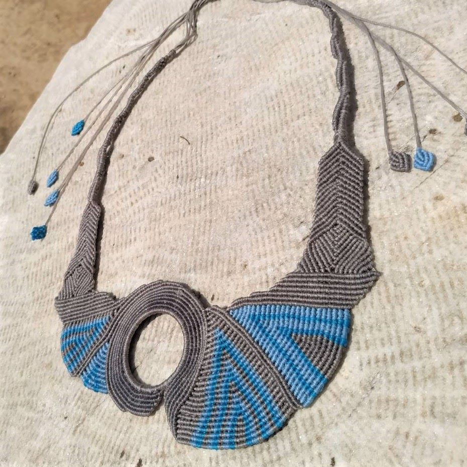 Το Ocean Wave είναι ένα statement χειροποίητο μακραμέ κολιέ με ιδιαίτερη γεωμετρική πλέξη και δυναμική μορφή κυμάτων. Πλεγμένο με γκρι και γαλάζια κηροκλωστή άριστης ποιότητας, δημιουργεί μια εντυπωσιακή συμμετρική σύνθεση που ακουμπά όμορφα στο στέρνο.
