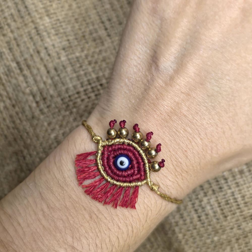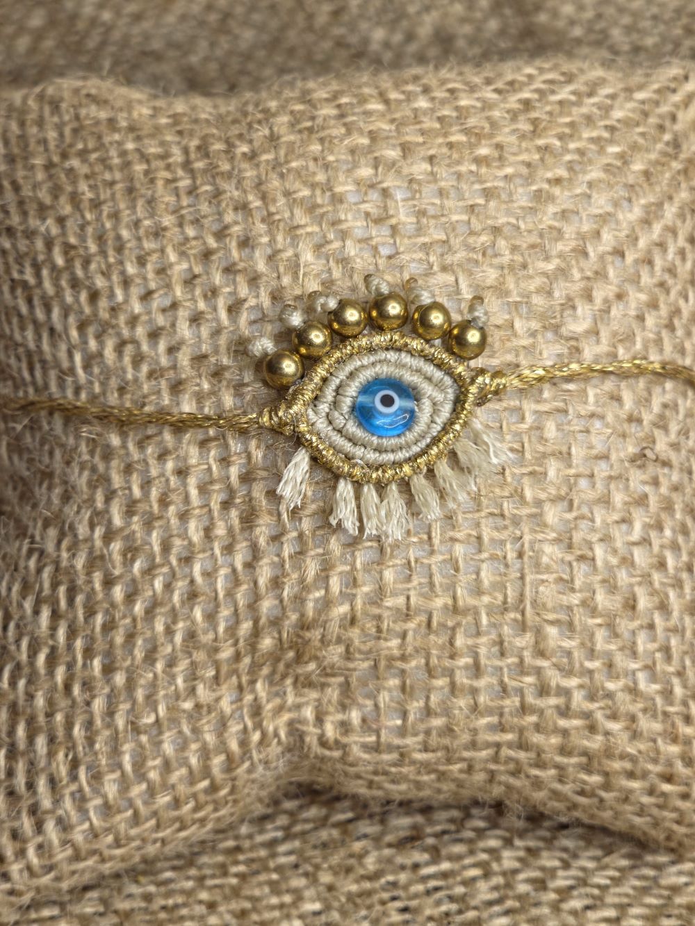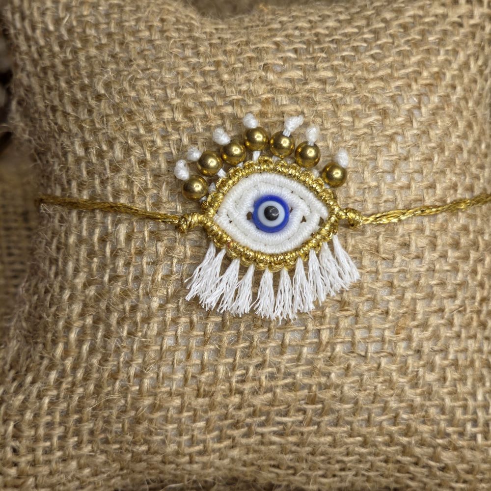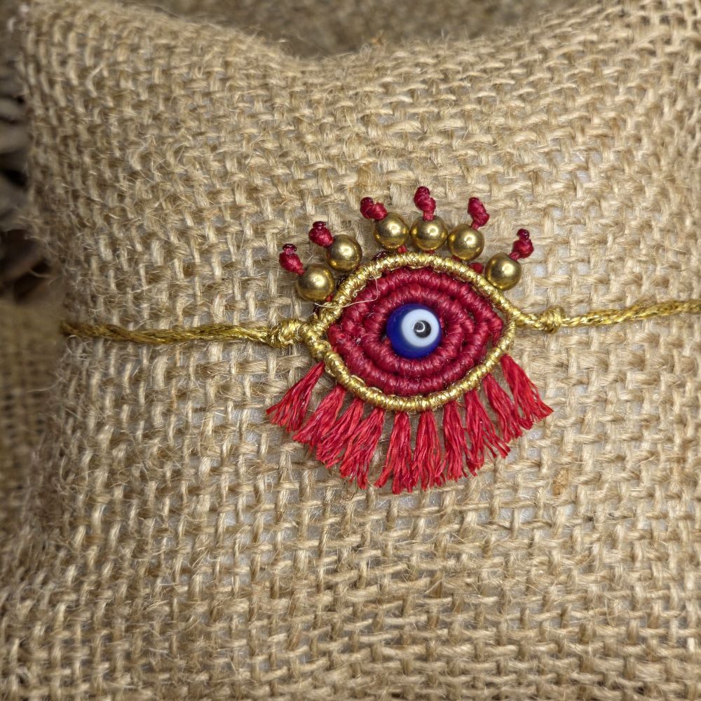 Το Sacred Eye είναι ένα χειροποίητο μακραμε βραχιόλι που λειτουργεί σαν φυλαχτό προστασίας και ενέργειας. Το μοτίβο του ματιού είναι υφασμένο στο χέρι και πλαισιώνεται από χρυσόχρωμες χάντρες αιματίτη που προσθέτουν λάμψη και γείωση.