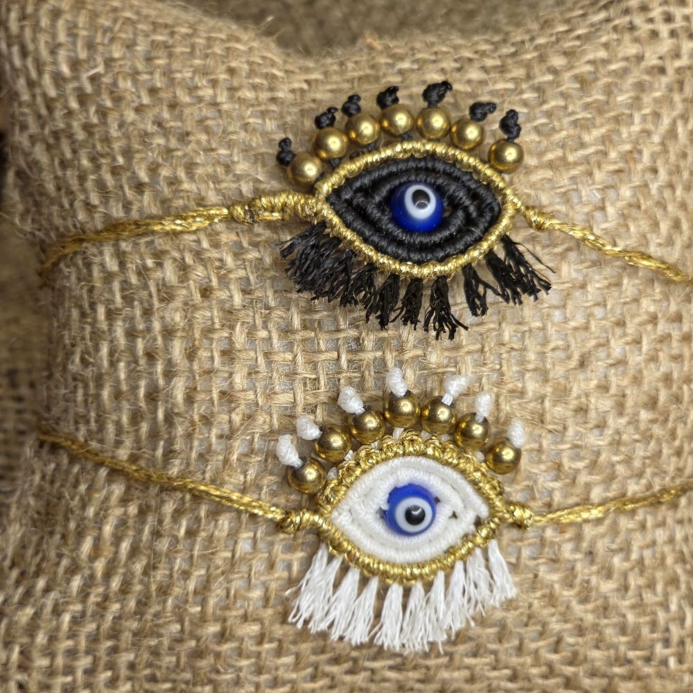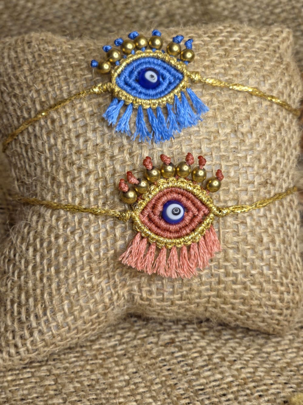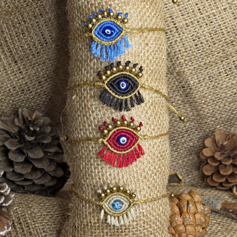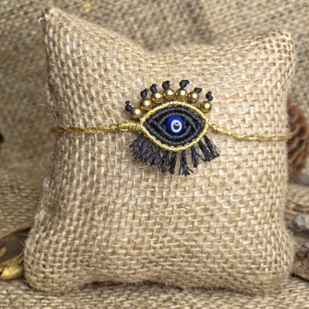 Το Sacred Eye είναι ένα χειροποίητο μακραμε βραχιόλι που λειτουργεί σαν φυλαχτό προστασίας και ενέργειας. Το μοτίβο του ματιού είναι υφασμένο στο χέρι και πλαισιώνεται από χρυσόχρωμες χάντρες αιματίτη που προσθέτουν λάμψη και γείωση.