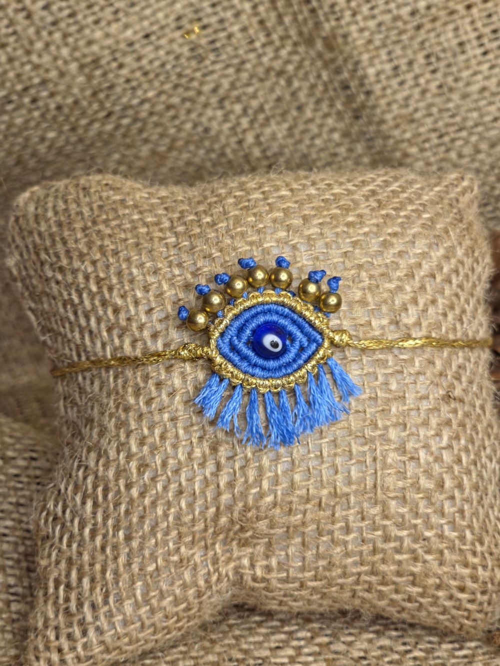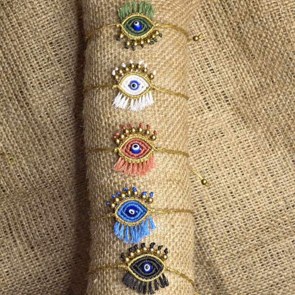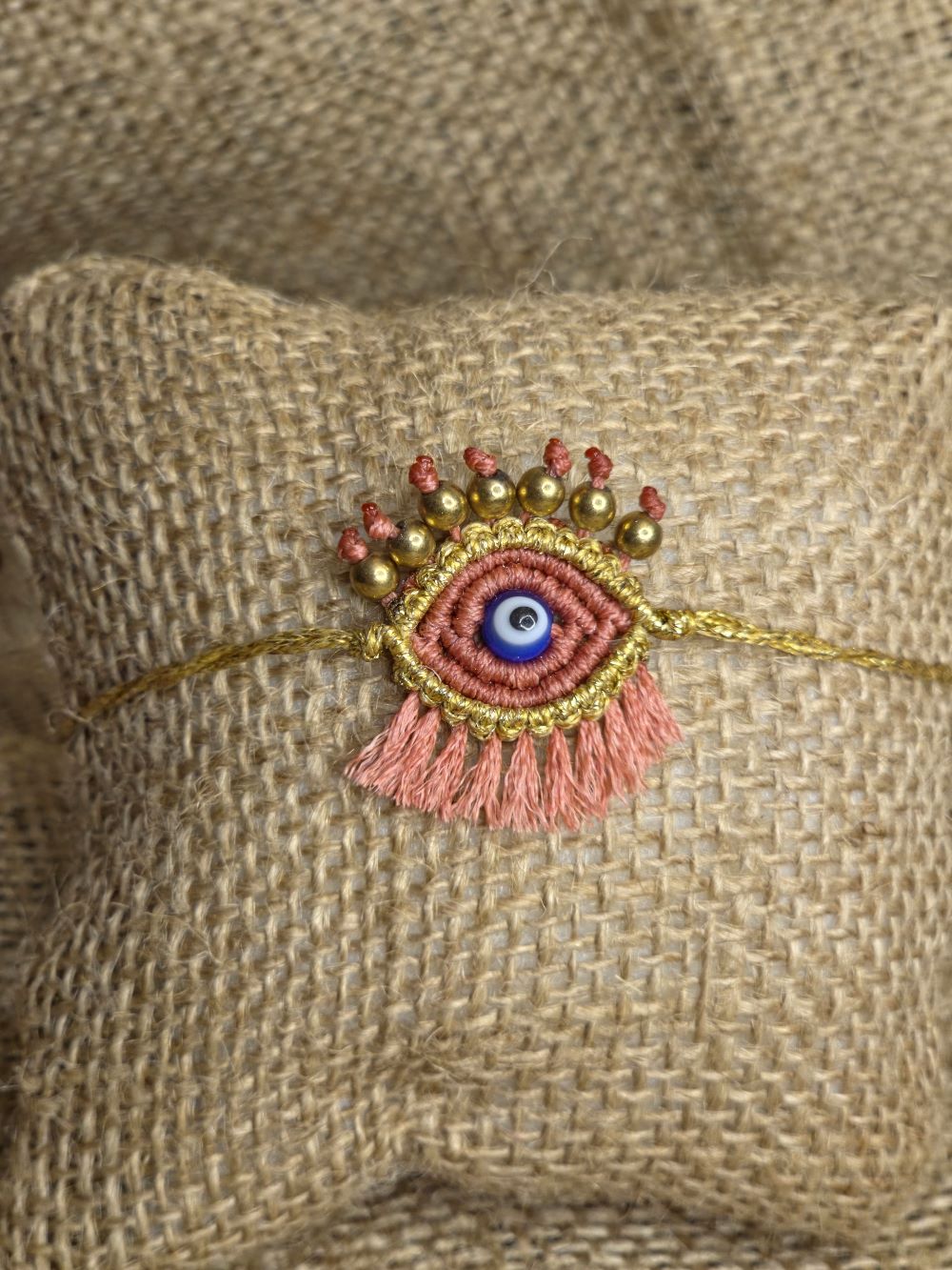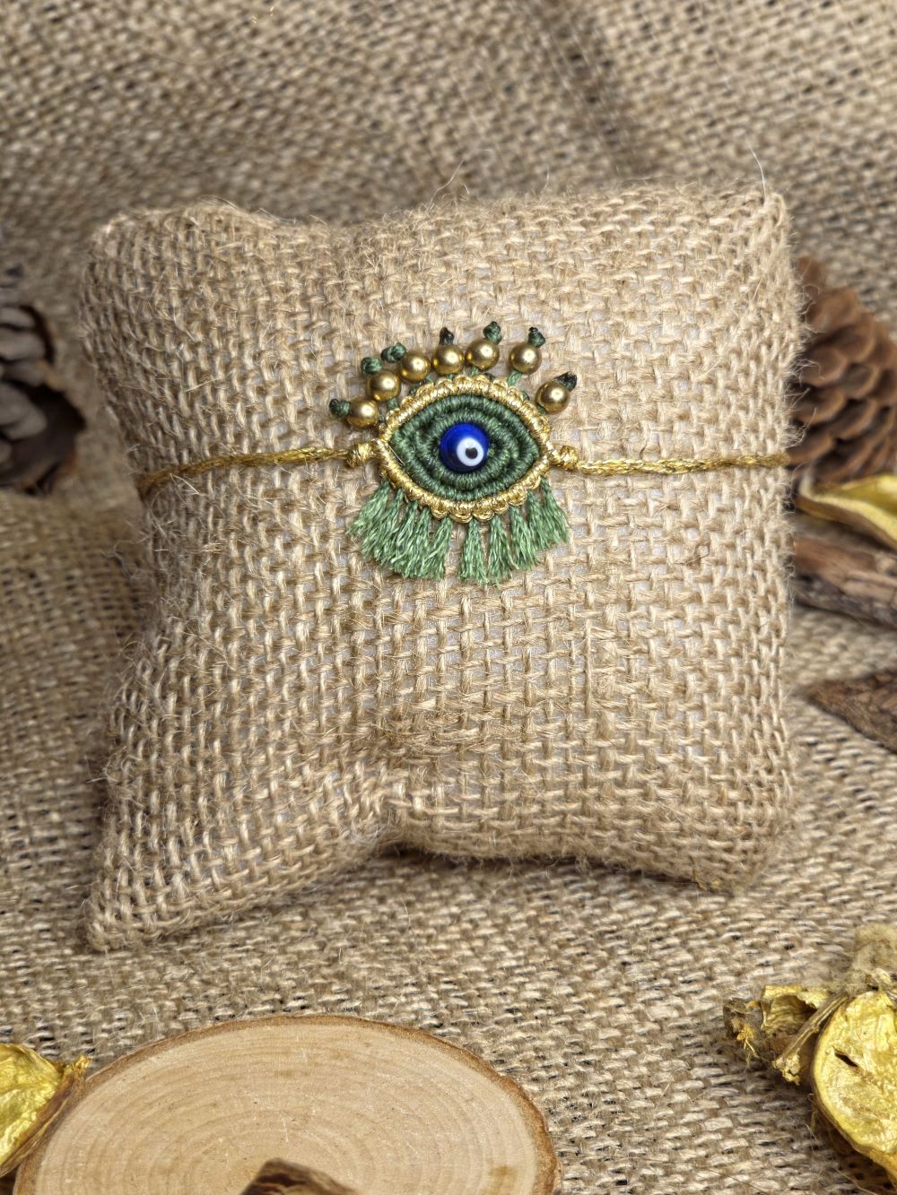 Το Sacred Eye είναι ένα χειροποίητο μακραμε βραχιόλι που λειτουργεί σαν φυλαχτό προστασίας και ενέργειας. Το μοτίβο του ματιού είναι υφασμένο στο χέρι και πλαισιώνεται από χρυσόχρωμες χάντρες αιματίτη που προσθέτουν λάμψη και γείωση.
