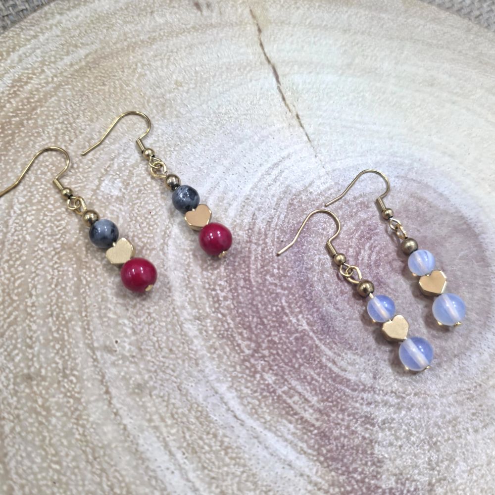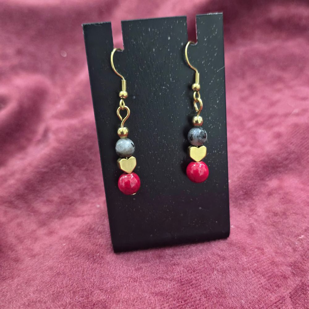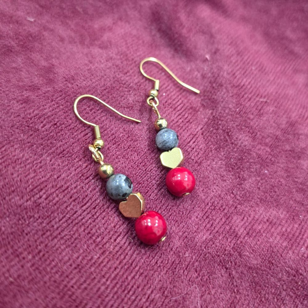 Η καρδιά και οι μικρές χάντρες αιματίτη λειτουργούν ως κοινό στοιχείο, συμβολίζοντας τη σταθερότητα και τη δύναμη της καρδιάς. Τα ατσάλινα γαντζάκια προσφέρουν άνεση και ανθεκτικότητα για καθημερινή χρήση.