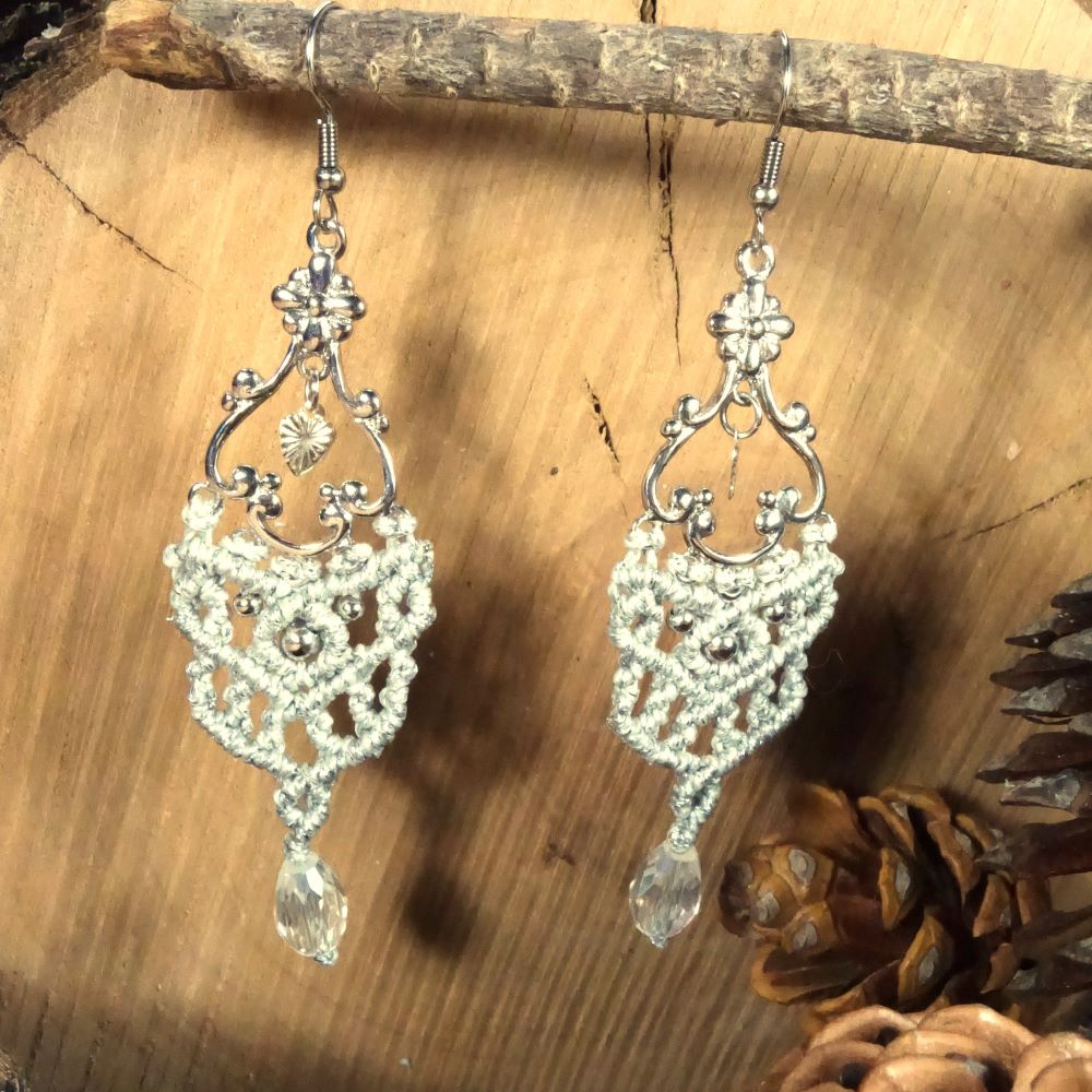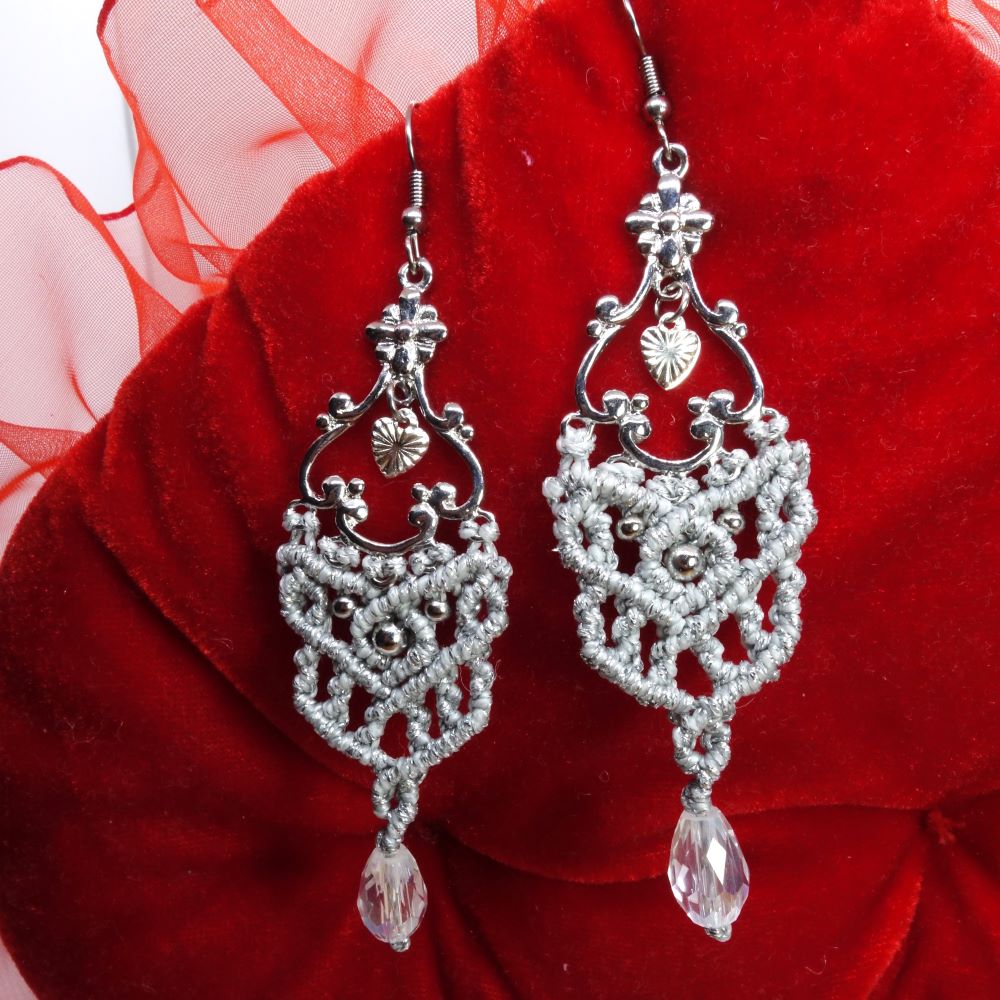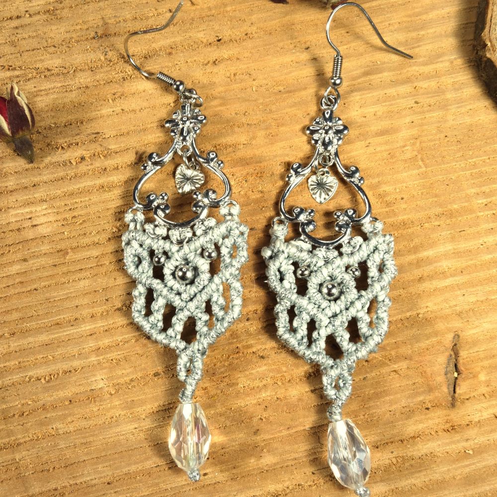 Χειροποίητα μακραμε σκουλαρίκια από ασημί κηροκλωστή με ατσάλινα γαντζάκια και διάφανο κρύσταλλο. Ελαφριά και διαχρονικά.