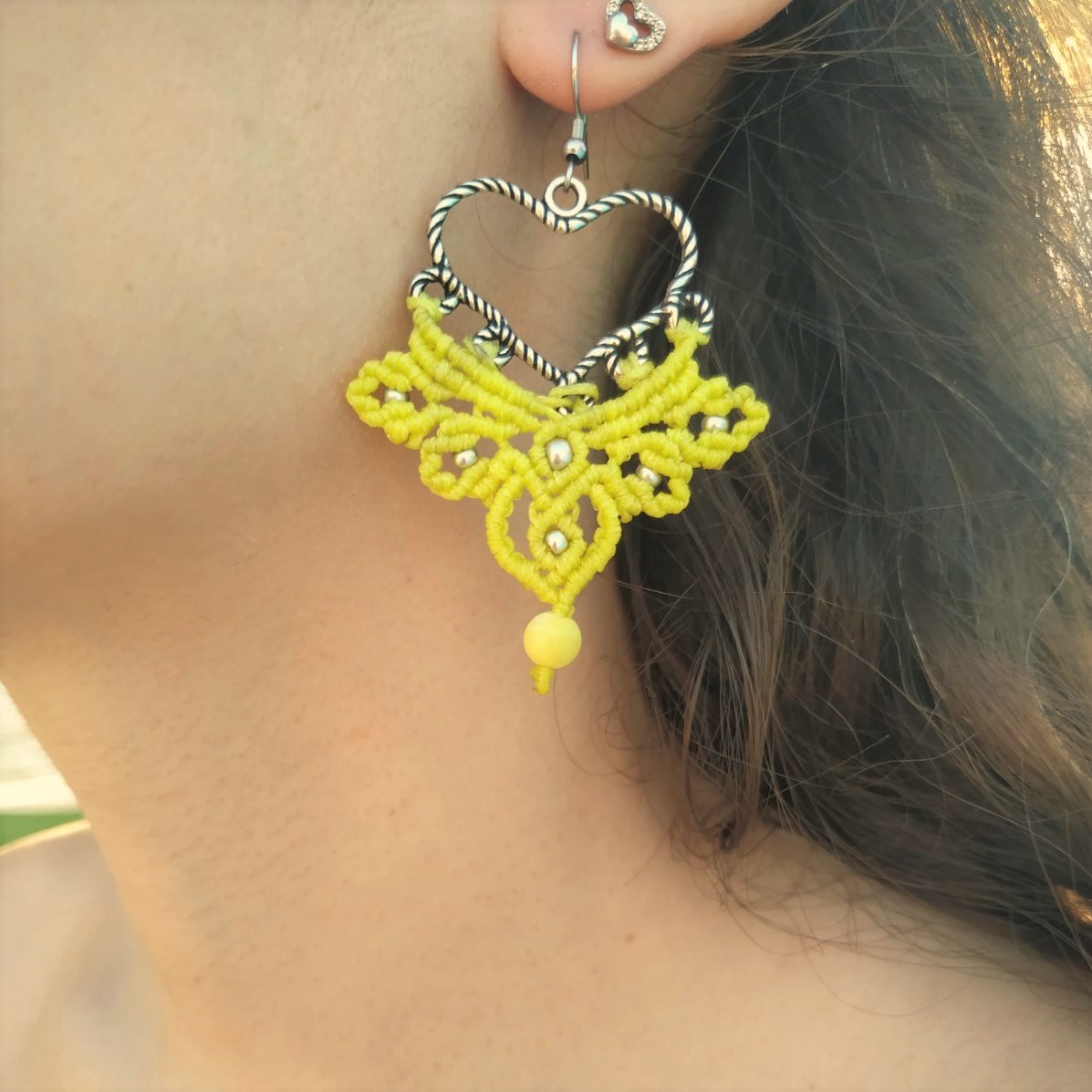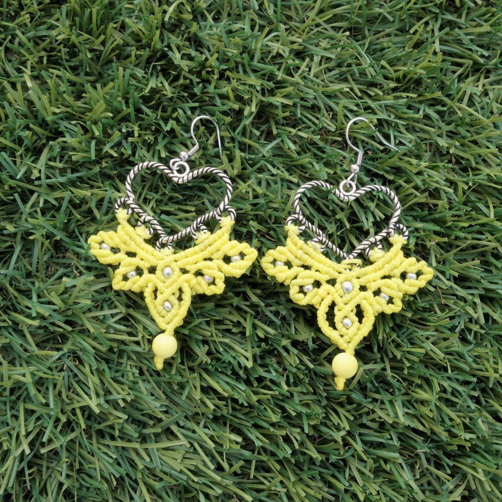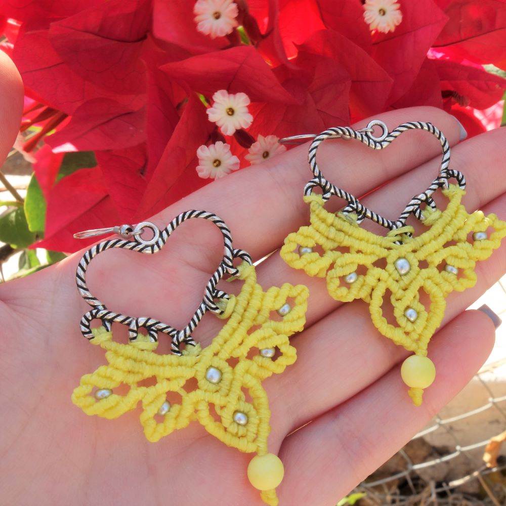 Χειροποίητα μακραμέ σκουλαρίκια με καρδιά, σε φωτεινό κίτρινο μοτίβο και λεπτομέρειες από ασημί χαντρούλες και ματ χάντρα για εντυπωσιακό αποτέλεσμα.