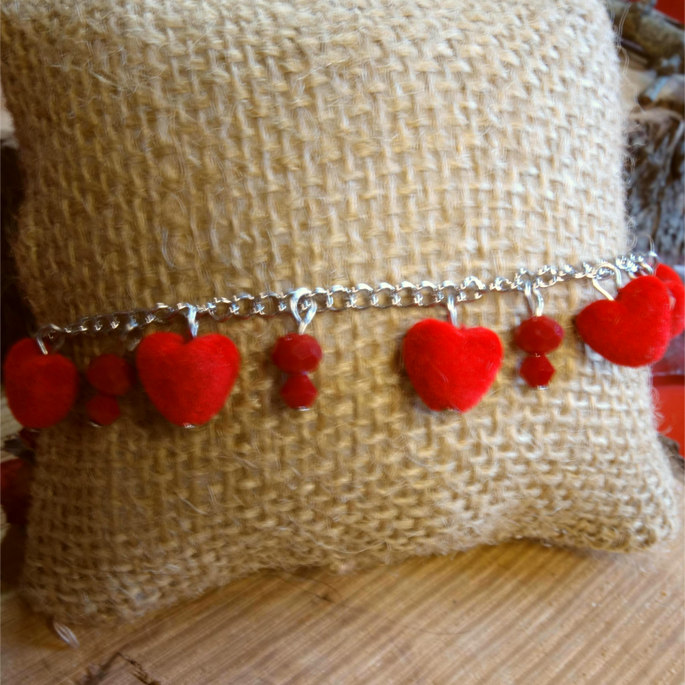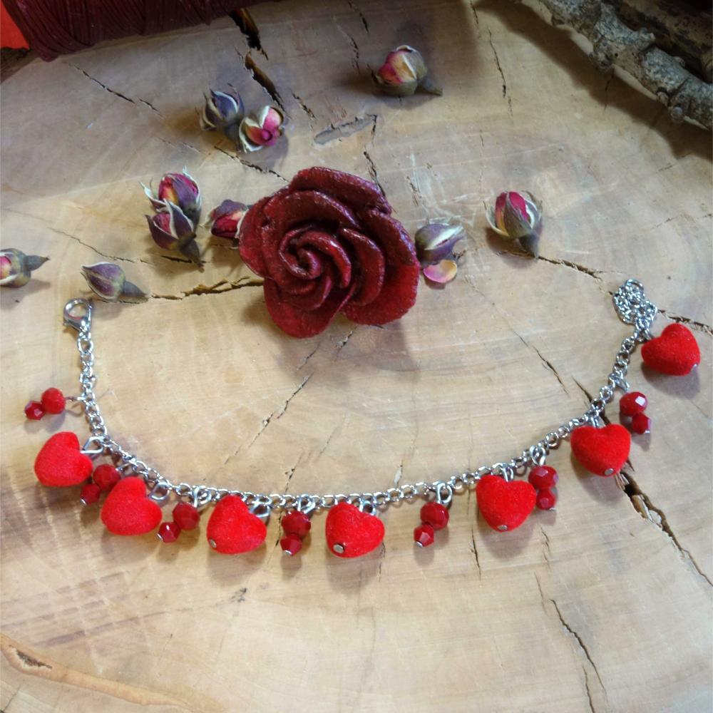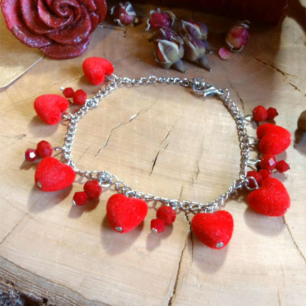 Οι καρδιές προσθέτουν υφή και απαλότητα, ενώ τα κόκκινα κρύσταλλα δίνουν διακριτική λάμψη σε κάθε κίνηση. Ένα βραχιόλι που φοριέται άνετα καθημερινά αλλά ξεχωρίζει και σε πιο ιδιαίτερες εμφανίσεις.